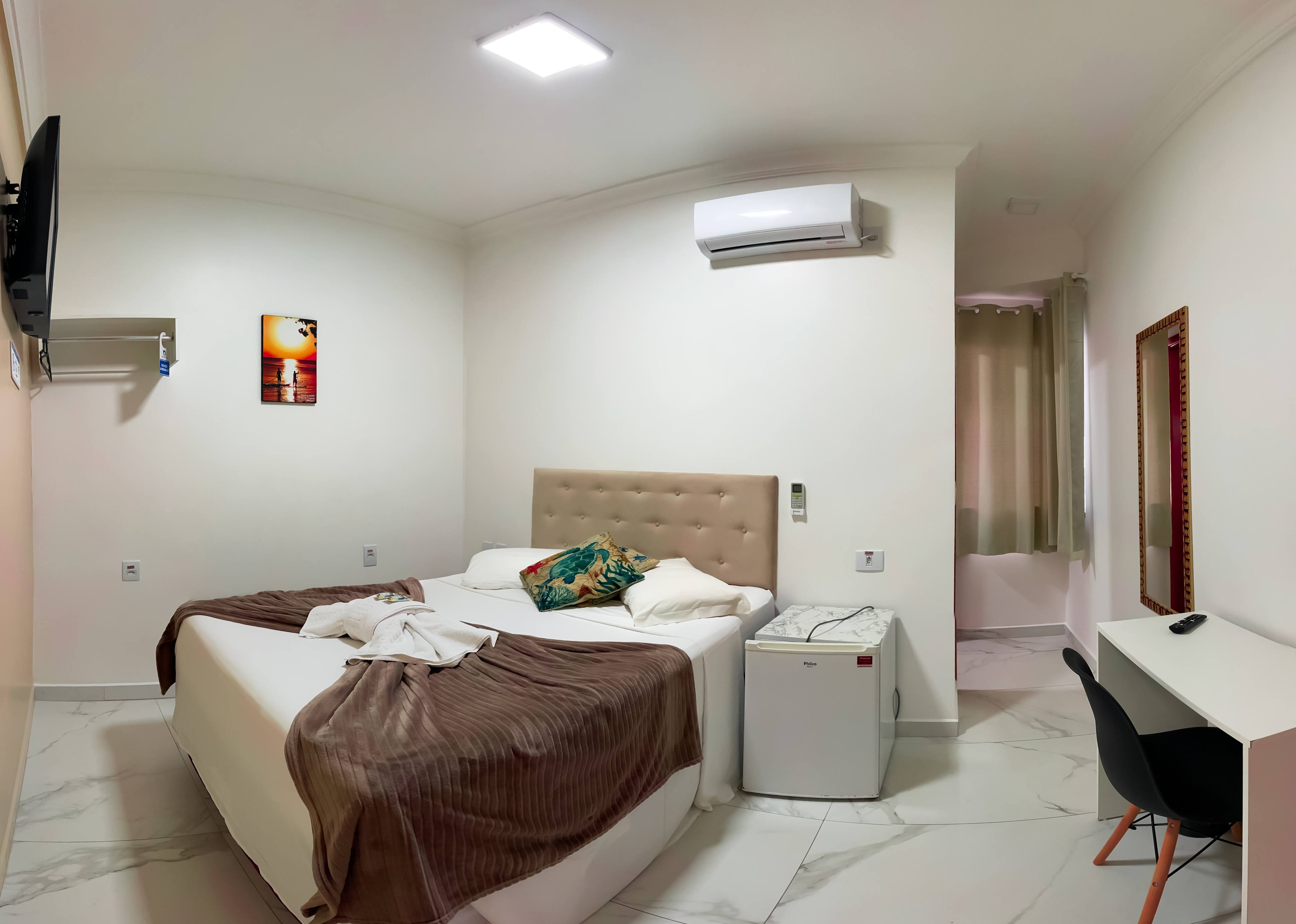 Perfeito para casais que buscam conforto e praticidade, nosso apartamento Standard Casal conta com uma cama de casal, ambiente aconchegante e todas as comodidades essenciais, como Smart TV, Wi-Fi, ar-condicionado, frigobar e banheiro privativo. Ideal para quem deseja descansar após um dia de passeios e diversão.